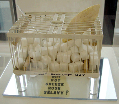 次に「ローズ・セラヴィ なぜくしゃみをしない?(図5)」であるが、なかに角砂糖が入っているように見える鳥籠である。しかし、この鳥籠は意外に重く、持った人はびっくりするそうである。角砂糖に見える白い立方体は大理石だからである。このことから「ローズ・セラヴィ なぜくしゃみをしない?」はキログラム原器のもじりであると考えた。鳥籠のなかに入っているものは152個の大理石とイカの甲、温度計、4本の止まり木である。