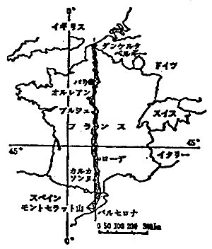 フィラデルフィア美術館のルイーズ&ウォルター・アレンズバーグ・コレクションにはデュシャンがふたりのために購入した何点かの作品がある(注4)。そのひとつにピエール・ロワの「メートル法(図7)」がある。そこには様々な計測機器が描かれている。これらのような機器を使ってフランス革命後のダンケルク―パリ―バルセロナ(図8)の間の子午線を測量したのであろう。また、机の上には天秤(trébuchet―デュシャンのレディ・メイドで床に張り付けたコート掛けもTrébuchetである)も載っている。アメリカ合衆国はいまだにヤード・ポンド法が一般的であり、メートル法になじまない国であるが、デュシャンの作品世界にはどうしても必要であったと思われる。