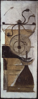 また、回転を描いたものとして「刃物研ぎ(図4)」のデッサン、「コーヒー・ミル(図5)」がある。そして、「コーヒー・ミル」のハンドルは水平と垂直の視点から描かれており(注4)、ハンドルの部分を同時に見ると天球儀、地球儀のような球形になる。6節で述べた球形の最も初めの形体はこの「コーヒー・ミル」であろう。
