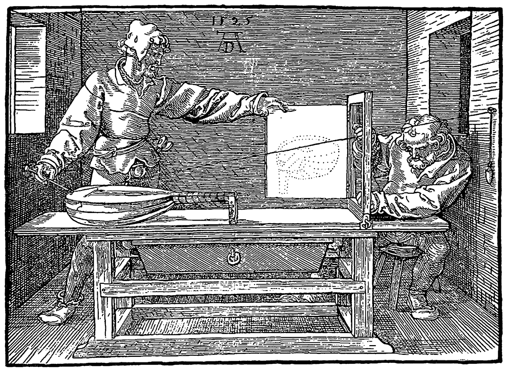 ほかにもデューラーとデュシャンを関係づけて論じている人たちは多くいる。ウルフ・リンデは「フォルトゥーナ」(注3)と北山研二は「リュートを描く製図工(図3)」(注4)を挙げている。また、東野芳明は「『遺作』再説」(注5)で「『透視画法の四態』裸婦を描く(図4)」と「遺作」の関係を述べており、谷川渥氏も「窓と女」(注6)でデューラーの「横たわる裸婦をデッサンする画家」(「『透視画法の四態』裸婦を描く」とおなじ)からデュシャンの「フレッシュ・ウィドウ」までを男性の視線を中心に述べている。